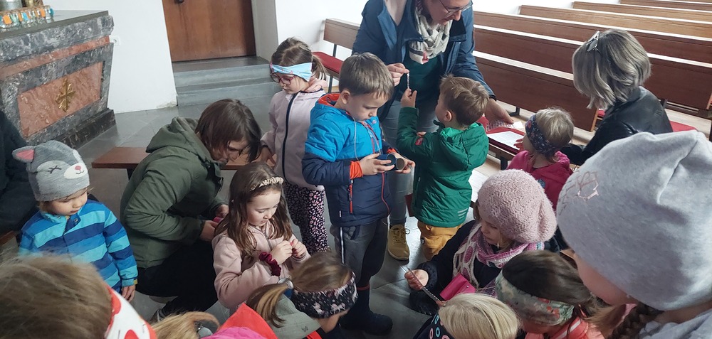 Ein Blick durch das selbstgebastelte Fernrohr und dann ging es los auf Entdeckungstour durch die Kirche. In Gruppen besuchten die Kinder die verschiedensten Stationen. Die Sakristei wurde von Dietmar Hirschbühl erklärt, Pfarrer Ratz ließ die Augen beim neuen Taufbecken, der Osterkerze sowie dem Altar strahlen. Sandra stimmte mit den Kindern die Orgel an und mit Anna wurden bei den Opferkerzen Wünsche zu Gott gesendet und den Beichtstuhl begutachtet. Zum Abschluss durften die Erstkommunionskinder noch den Kirchturm erklimmen.