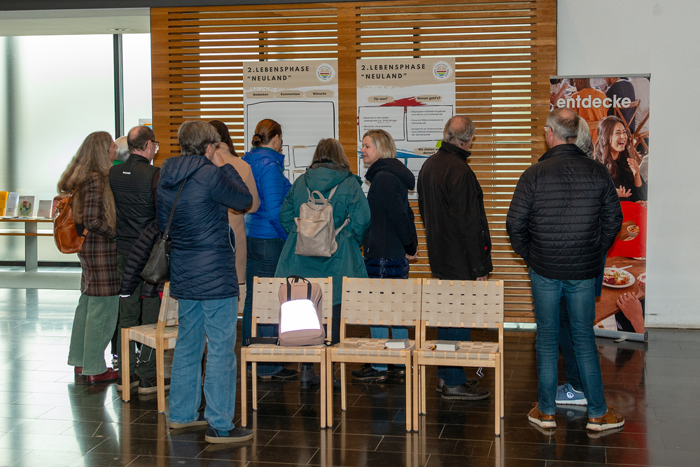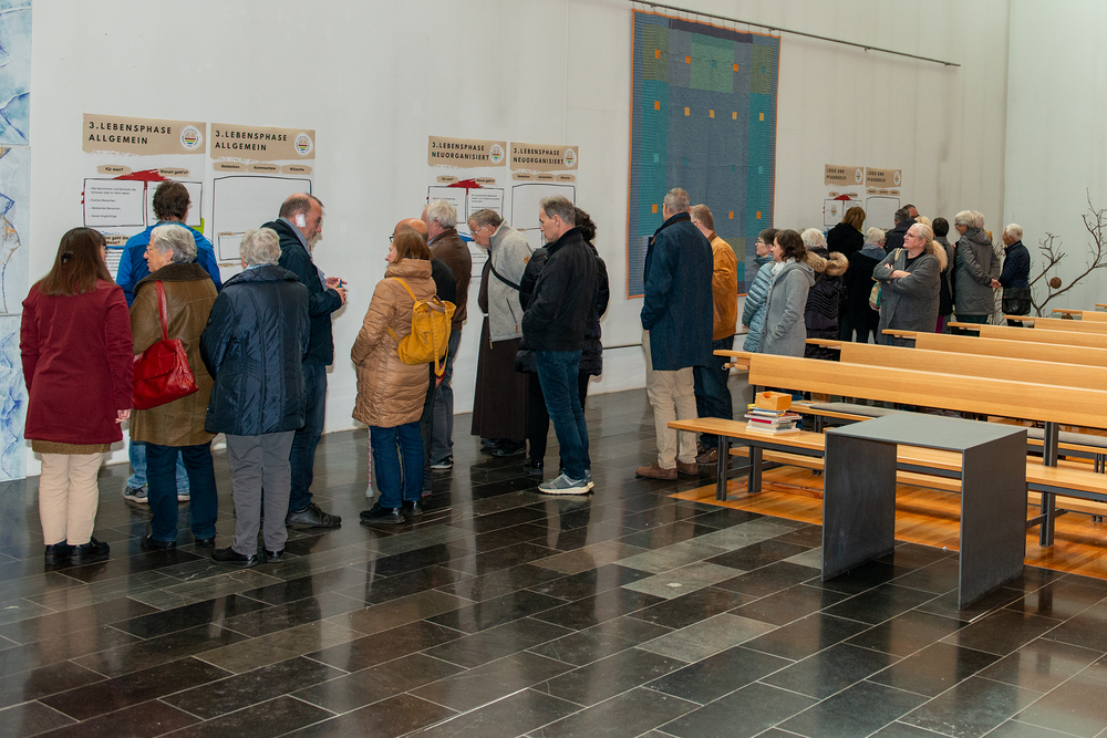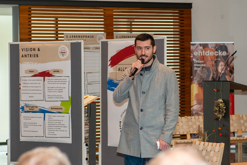 Im Anschluss daran nahmen wir uns Zeit, vom laufenden Pfarrverbands-Prozess zu erzählen und mit den Gemeindemitgliedern in den Austausch zu gehen. Dafür wurden mehrere Stationen mit Informationsplakaten hergerichtet, an denen man sich zu den einzelnen Themen und Arbeitsgruppen informieren konnte. Außerdem gab es die Möglichkeit, bei den jeweiligen Stationen seine eigenen Gedanken und Anregungen miteinzubringen. Die aktive Beteiligung an dieser Zeit des Austausches war erfreulich hoch und es benötigte aufgrund des regen Interesses mehrere Anläufe in der Moderation diesen Programmpunkt der Versammlung zu beenden.