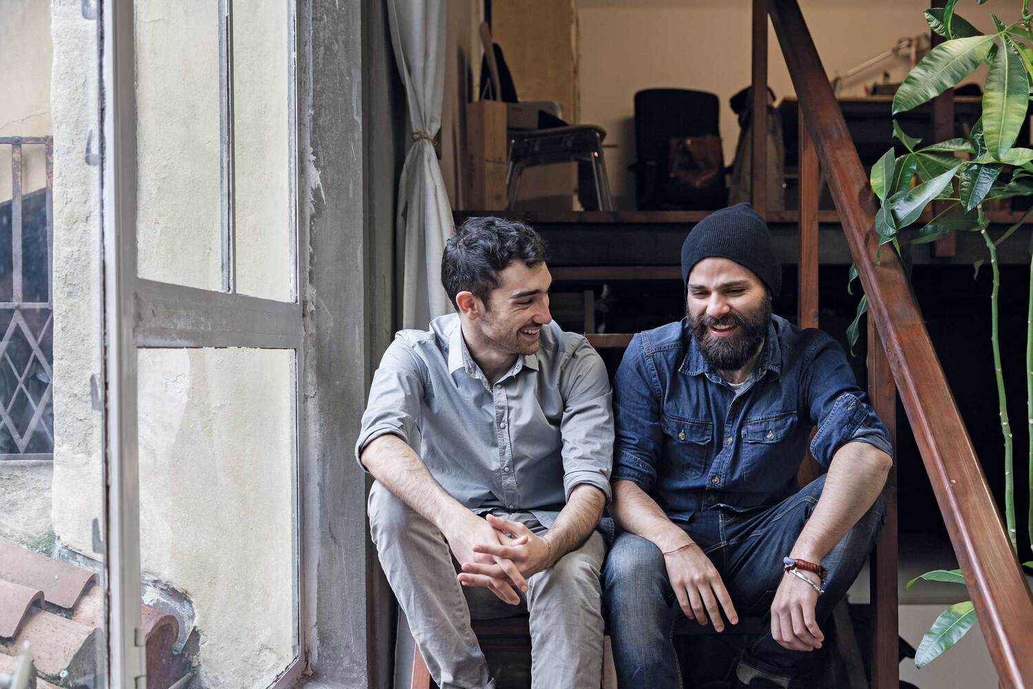 Outdoor shot of young couple walking through meadow hand in hand. Man and woman talking walk through grass field in countryside.